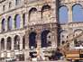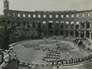 Der Bau des Amphitheaters - Arena - von Pula begann schon zur Regierungszeit des Kaisers Augustus, zum Anfang des 1. Jahrhunderts, während es in der Zeit der Dynastie der Flavier erweitert wurde, und sogar 23 000 Zuschauer aufnehmen konnte. Die Arena wurde aus dem einheimischen Kalkstein im toskanischen Stil erbaut und besteht aus vier Etagen mit der größten Höhe von 33 Meter. Da sie an einem Abhang gebaut wurde, erhebt sich der östliche Teil, der auf einer natürlichen Anhöhe steht, nur zu den zwei oberen Stockwerken. Das volle Profil bestand aus 72 halbkreisförmigen Arkaden, während das letzte Stockwerk 64 viereckige Fenster hatte; im Fall von schlechtem Wetter bestand die Möglichkeiten, den Zuschauerraum mit Masten und Segeltüchern zu überdecken. Auf der Hauptachse sind die Bögen etwas breiter, um so die Haupteingänge zu betonen, aber der wichtigste war jener an der Südseite, der zur Stadt gekehrt ist. Der zentrale Teil jedes Amphitheaters war die Kampfarena, wo Gladiatorenkämpfe, Jagden und öffentliche Gerichtsverhandlungen veranstaltet wurden. Der Eingang in den Zuschauerraum war frei, aber der Sitzplan war streng nach dem gesellschaftlichen Ansehen und Reichtum geregelt, wobei die Ärmsten ihren Platz auf der letzten Etage mit dem schlechtesten Blick auf die Arena hatten. Panem et circenses, Brot und Zirkusspiele, war das Motto der Römer, weil sie mit der Organisation der Spiele und Verteilung von Brot vor deren Beginn das Volk ablenken konnten. Unter der Arena befand sich ein behelfsmäßiger unterirdischer Raum, in dem sich Käfige für Tiere befanden; darin kann man heute eine ständige Ausstellung über Olivenzucht und Weinbau in Istrien in der Antike besichtigen. Wegen ihrer imposanten Größe wurde die Arena außerhalb der Stadtmauern des römischen Pula erbaut; zu ihr führte damals die Straße Via Flavia, heute noch eine der Hauptverkehrsadern der Stadt. Heute werden in der Arena kulturelle Manifestationen wie das Filmfestival oder verschiedene Konzerte abgehalten.
