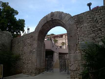 La Porte d'Hercule à Pula est située entre deux tours rondes, probablement datant du Moyen-âge. Elle est d'une architecture simple, construite de blocs de pierre non polis. Au sommet de la porte, sur l'arcade se trouve le relief de la tête d'Hercule, grossièrement taillé dans la pierre, sur laquelle on aperçoit sa barbe et ses cheveux bouclés, accompagnée du relief de sa matraque. Il est possible, qu`il s'agisse d'un symbole de protection de la ville, qui est soutenu par le fait que le nom romain complet de Pula était "Colonia Iulia Pollentia Herculanea". L'inscription située près de la matraque est endommagée, elle mentionne deux officiers romains Lucius Calpurnius Pise et Gaius Cassius Longinus. Selon des sources, le premier était le beau-père de Jules César et le père de sa femme Calpurnius, le second était frère de Cassius Longinus qui avait le même nom et avait participé à l'assassinat de César. Ils ont été probablement envoyés dans la baie de Pula par le Sénat romain, en commandant un groupe de colons, pour établir et construire une colonie. L'événement célèbre est caractéristique pour la période des années 47 à 44 avant Jésus Christ, quand Pula est née comme une cité avec des caractéristiques urbaines. La Porte d'Hercule n`était pas richement décorée et elle ne se distinguait quasiment pas de l'enveloppe extérieure de murs de la ville de Pula. Il est donc fort probable que pendant le règne de Rome elle n'était pas d'une grande importance. La rue circulaire de la ville passait par cette porte, la position inclinée de la a conditionné l`axe de la porte par rapport à la direction des murs. Comme la porte double, elle a été découverte au début du 19eme siècle et dans les années trente du 20ème siècle elle a été nettoyée et conservée. Aujourd'hui elle est l'entrée dans le bâtiment de la communauté italienne de Pula.