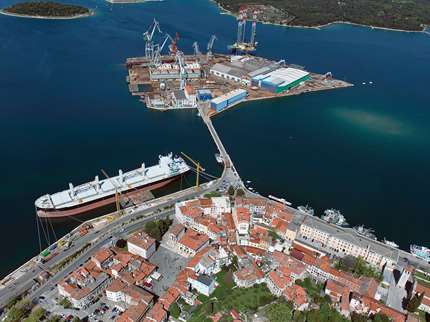 A l'époque Austro-hongroise, au milieu du 19ème siècle, elle est devenue le principal port naval de l'Empire, et commence alors la construction de l'arsenal de la Marine austro-hongroise. Situé sur la côte sud de la baie de Pula, entourée de hautes collines, protégée du côté de la mer par les îles de Brijuni, en raison de sa grandeur et de sa protection contre les vents et les vagues, la baie de Pula est l'un des port naturel les plus appropriés. Les premiers travaux ont commencé en 1848 avec la construction de trois magasins et d'une pierre angulaire de l'arsenal posée en 1856 par l'impératrice Elizabeth. En même temps ont construit l'hôpital de la marine et la caserne de Franz Joseph. L'Arsenal a été construit et organisé de la façon la plus moderne, avec divers ateliers, tels que ceux pour la fabrication des mâts et des voiles, l'atelier de charpentier ou l'atelier de montage des grues, ainsi que d'une fonderie de fer. Pour conduire tous les ateliers et les quais, 52 chaudières à vapeur étaient utilisées, avec 36 moteurs à vapeur et des moteurs à gaz. Déjà au milieu du 19ème siècle, deux cales de lancement couverte dans l'îlot Uljanik, faisant partie de l'Arsenal, ont été construite avec un châssis de fer fabriqué à l'usine de Witkowice, ce qui suggère que de nouvelles tendances modernes architectural n'ont pas épargner Pula. La tradition de la construction navale à Pula à perdurer dans le temps et s'est développée jusqu'à nos jours grâce au chantier naval Uljanik.