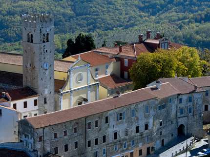 Au dessus de remparts intérieurs, se dresse la haute façade du palais communal, une construction romane du 12ème ou 13ème siècle. Les comtes de Gorica gèrent la ville dès le 12ème siècle. D'après les premiers murs et bâtiments, parmi lesquels se trouve le palais communal, on peut supposer qu'au 13ème siècle Motovun fonctionnait comme un centre artisanal et commercial, avec une citadelle fortifiée. Même si à première vue le palais communal apparait comme un bâtiment quelconque, il possède toujours sur sa façade des restes des fenêtres romanes murées, des bifores. Sur certaines d'entre elles, les chapiteaux du centre ont été préservés et leur forme relève du style roman du 13ème siècle. Le palais communal de Motovun est d'ailleurs le bâtiment public roman le mieux préservé , mais aussi de Croatie. Il est intéressant de savoir que le palais communal a conservé sa fonction d'origine et aujourd'hui encore, c'est dans ce bâtiment que se trouvent les bureaux de la mairie de Motovun.