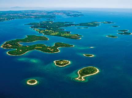 L'archipel de Brijuni est situé au sud de la côte ouest de l'Istrie, il compte 14 îles et îlots, c'est l'archipel le plus grand d'Istrie. Les îles de Brijuni, avec ses eaux environnantes et ses fonds marins, ont été déclarés parc national en 1983, grâce à sa richesse exceptionnelle. L'île la plus importante est la grande île de Brijuni, qui comme les autres îles, possède une côte relativement basse et rocailleuse, mais tout de même facile d'accès. L'archipel géologique et géomorphologique de Brijuni est la continuité de la côte ouest de l'Istrie, il n'est pas surprenant de savoir qu'il y a environ 10 000 ans, il faisait partie intégrante du continent istrien. Les îles de Brijuni sont riches des empreintes de dinosaures qui ont habité les îles il y environ 160 millions d'années. On en trouve à quatre endroits sur la grande île de Brijuni. On situe les dinosaures sur les îles de Brijuni à l'âge de craie, dernière période avant leur extinction, plus de 200 empreintes magnifiques de reptiles peuvent être vues dans le parc de craie. Ces restes ont été retrouvés en 1925 déjà, mais des recherches détaillées se sont achevées dans les années 90 du siècle dernier, lorsque l'on a découvert que les empreintes appartenaient à des théropodes bipèdes carnivores et à des carnivores rapides et agressifs de la famille des Coelurosaria. La vie animale sur les îles a été enrichies par de nombreuses espèces animales importées, en plus des espèces autochtones tels que les lièvres et différentes espèces d'oiseaux. Il y a eu des espèces animales exotiques et moins exotiques, qui se sont parfaitement acclimatées, telles que le léopard, les lamas, les zèbres et les éléphants. En plus de la faune, la flore joue un rôle incontournable. Le climat méditerranéen, avec beaucoup de soleil, de chaleur et suffisamment d'humidité dans l'air, a permis le développement d'une végétation autochtone dense, telle que le chêne vert et la myrte, qui est complétée par différents types de pins, de séquoia, de sapins et d'eucalyptus qui ne sont pas des espèces typiques aux îles de Brijuni. Parmi la flore de Brijuni, l'arbre le plus connu est le célèbre vieil olivier, l'un des plus anciens de la Méditerranée. Vieux de 1600 ans, il donne toujours des fruits avec lesquels on fait de l'huile d'olive.